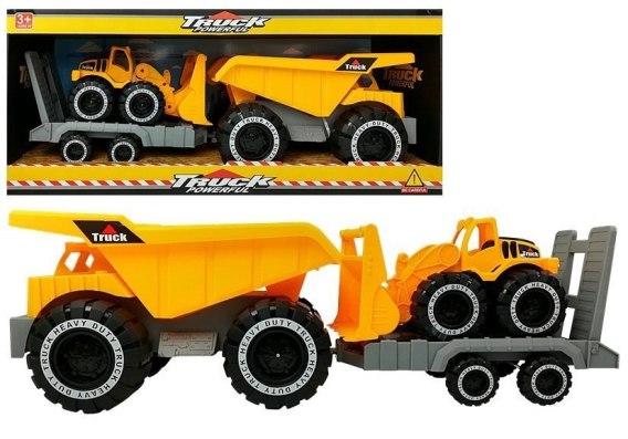 Jeżeli Twoje dziecko jest fanatykiem dużych, budowlanych samochodów, to będzie to idealny zestaw dla niego. Dzieci często wcielają się w rolę dorosłych, dlatego też idealnym pomysłem na prezent jest zestaw wywrotki z przyczepą ze spychaczem. Dzięki temu zestawowi każde dziecko może poczuć się jak budowniczy na prawdziwym polu budowy. Żółto-czarny pojazd ozdobiony jest naklejkami z napisem TRUCK. Wywrotka osadzona jest na dużych, masywnych kołach, które posiadają bieżnik, dzięki czemu autko pokona każdą drogę. W zestawie znajduję się także przyczepa, którą można przypiąć do pojazdu i przewozić nią spychacz. Dodatkową zaletą jest spychacz, który świetnie nadaje się do napełniania naczepy. Pojazd posiada bardzo ładowną skrzynię wywrotową, w której można transportować sypkie materiały takie jak kamyczki, piach, a następnie w szybki i prosty sposób wysypywać w danym miejscu. Zestaw wykonany jest z wysokiej jakości certyfikowanego plastiku, który jest w pełni bezpiecznym materiałem dla dziecka.