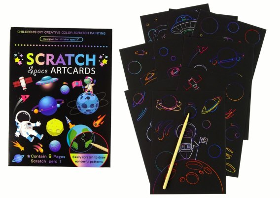 W zestawie znajdziesz 9 obrazków do zdrapywania, które ożywiają się przed oczami dziecka. Zabawa jest prosta: używając specjalnego drewnianego patyczka, można zdrapywać czarną warstwę na obrazku, odkrywając piękne i kolorowe ilustracje. Te ilustracje przedstawiają różne sceny z kosmosu.