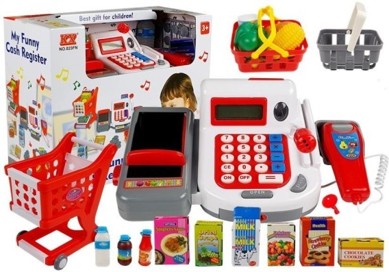 W zestawie znajdziemy mnóstwo akcesoriów niezbędnych dla każdego sprzedawcy. Pojemny wózek na zakupy, oraz dwa mniejsze koszyczki pozwolą nam spokojnie wybierać produkty. Po skończonych zakupach zapłacimy dołączonymi do zestawu banknotami i monetami. W naszym sklepie możemy również zapłacić kartą, a towar do skasowania układamy na przymocowanej do kasy taśmie, którą przesuwamy suwakiem. Mikrofon i wyświetlacz pozwolą nam do końca poczuć się jak prawdziwy kasjer.