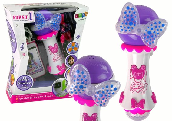Różowo-fioletowy mikrofon zaprojektowano z myślą o najmłodszych. Ozdobiono go detalami w białym kolorze, dzięki czemu prezentuje się rewelacyjnie. Kokardka i kula, umieszczona w dolnej części zabawi, świecą podczas występu, urozmaicając zabawę. Wielofunkcyjna zabawka pobudza rozwój dziecka na kilku płaszczyznach — usprawnia słuch, zdolności muzyczne i rytmiczne małej gwiazdy, a także polepsza wyobraźnię, koncentrację i koordynację ruchową.