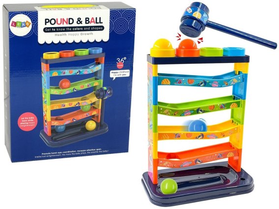 Należy włożyć piłeczki do otworu znajdującego się w pierwszej platformie, a następnie pozwolić im swobodnie pokonywać pięterka i opadać w dół. Aby kulka wpadła do środka, należy użyć młotka, ćwicząc przy tym ocenę odległości, precyzję i koordynację oko- ręka. Każdy otwór ma inny kolor, tak jak piłeczki, można spróbować dopasowywać odpowiednie kolory, co będzie ćwiczyć u malucha jego spostrzegawczość i funkcje wzroku. Piłeczki podczas poruszania wydają dźwięki jak grzechotki, co zwróci uwagę malucha.